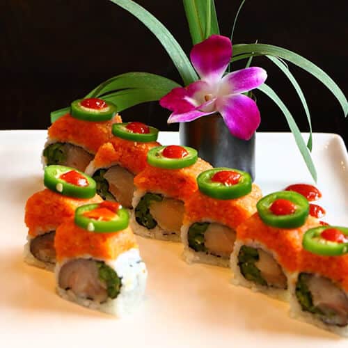 Yellowtail, pickled jalapeno, topped with spicy tuna/salmon, jalapeno, spicy mayo, honey wasabi and eel sauce